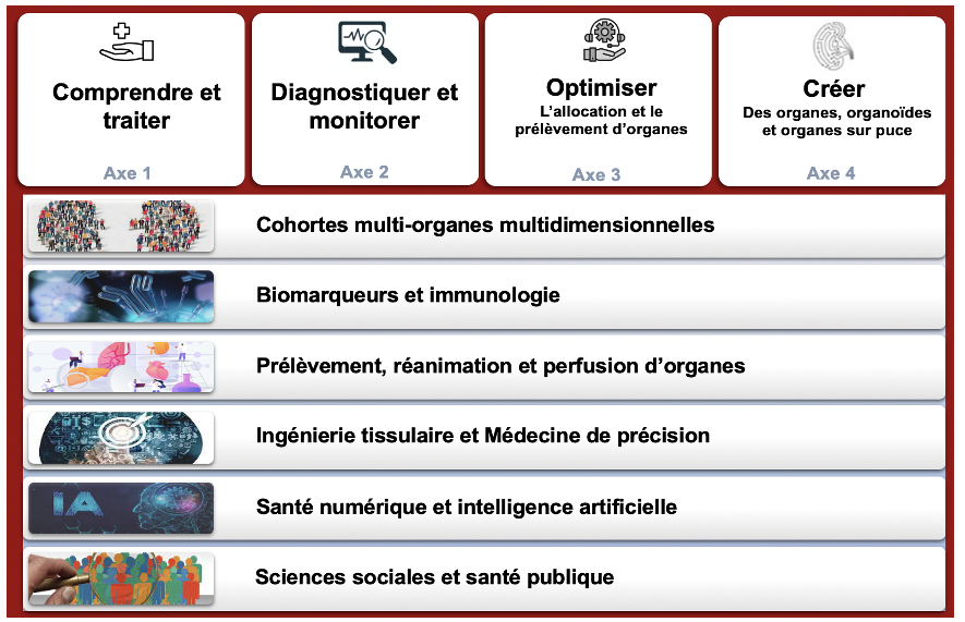 Quatre axes structurent les activités de recherche au sein de l’Institut (comprendre et traiter ; diagnostiquer et monitorer ; optimiser le prélèvement, la conservation et l’allocation des organes ; créer des organes, organoïdes et organes sur puce) qui sont déployés autour de six thématiques (Cohortes multi-organes multidimensionnelles ; Biomarqueurs et immunologie ; Prélèvement, réanimation et perfusion d’organes ; Ingénierie tissulaire et Médecine de précision ; Santé numérique et intelligence artificielle ; Sciences sociales et santé publique).