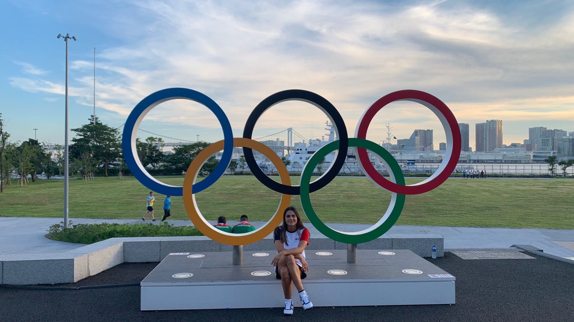 Blandine Pont et les fameux anneaux olympiques avec en arrière-plan Tokyo et le « rainbow bridge ».