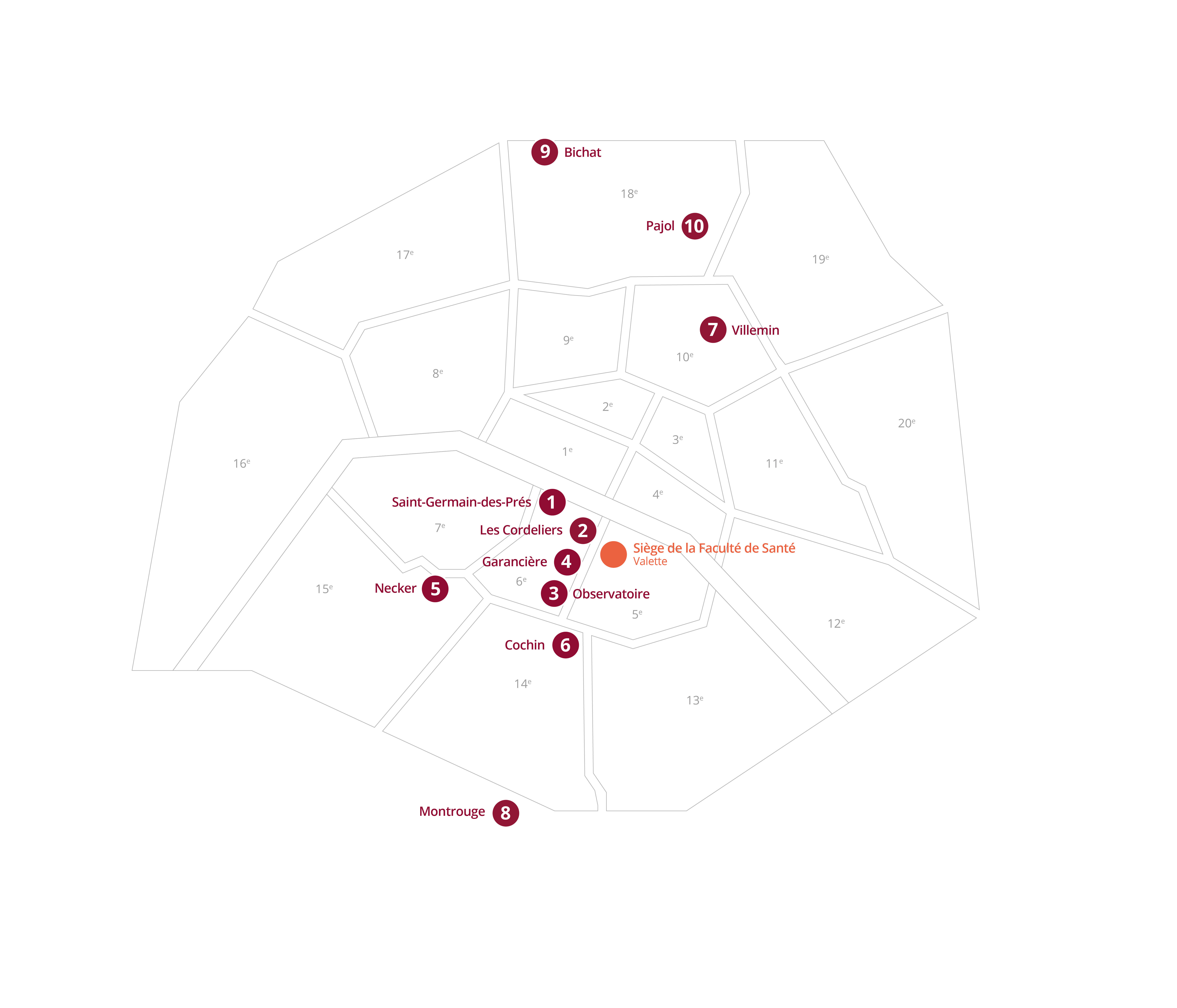 Le siège de la Faculté de Santé est situé au 2 rue Valette dans le 5e arrondissement de Paris. Ses sites et campus s’étendent du Nord au Sud de Paris, jusqu’à la commune de Montrouge.