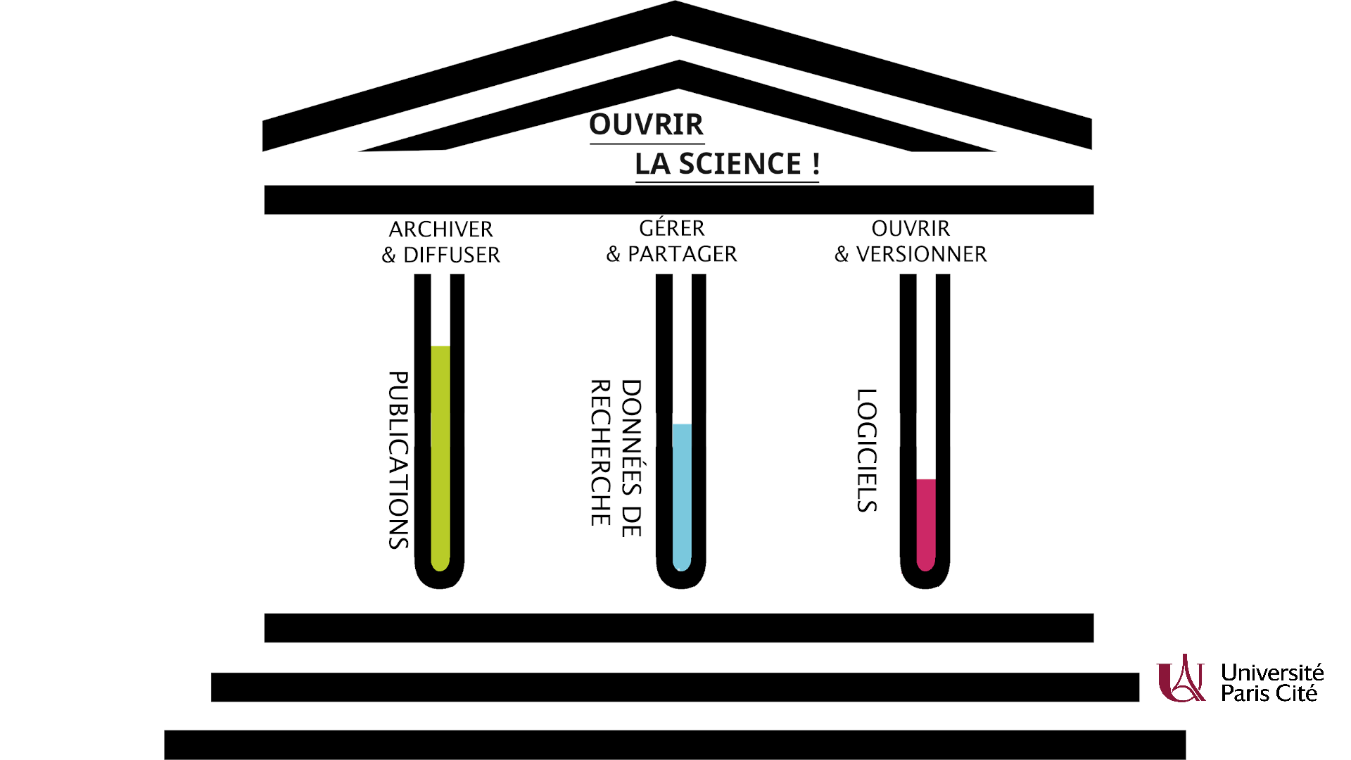 Schéma des 3 piliers pour l’ouverture de la science : archiver et diffuser les publications, gérer et partager les données de la recherche, ouvrir et versionner les logiciels