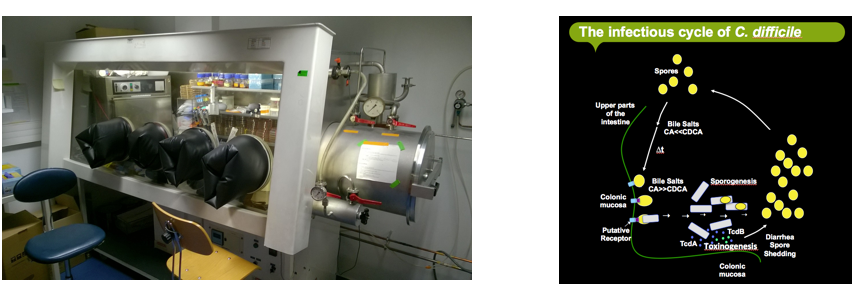 C’est aujourd’hui le principal entéropathogène bactérien isolé des diarrhées nosocomiales chez l’adulte. Les infections à C. difficile sont dues généralement à l’ingestion de spores présentes dans l’environnement. La production de deux toxines (TcdA et TcdB) et leur régulation est un élément déterminant du pouvoir pathogène de cette bactérie. Cependant d’autres facteurs de virulence semblent intervenir au cours du cycle infectieux.