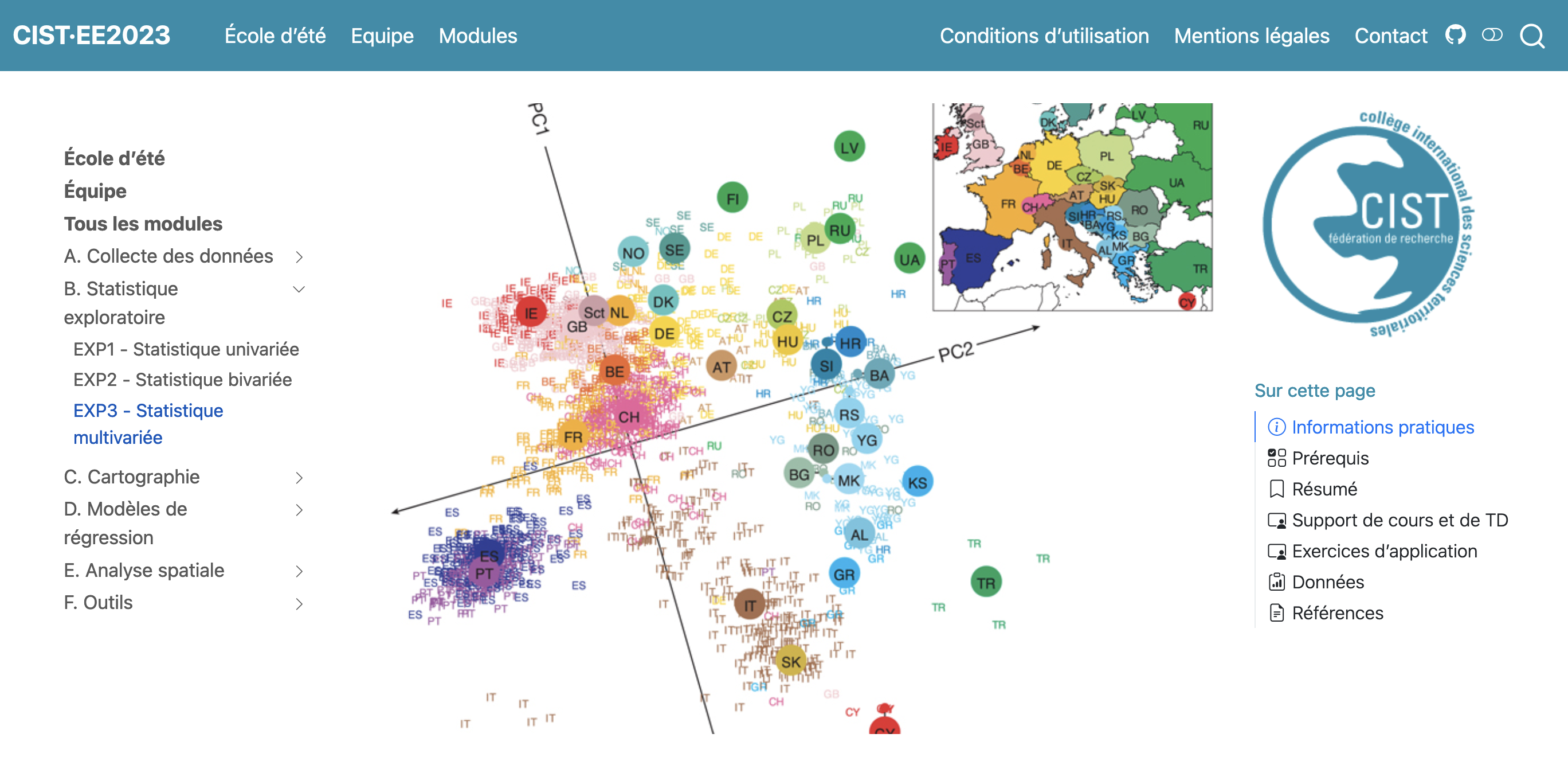 Produit tangible de cette école d’été, librement accessible à la communauté scientifique et pédagogique, le site ee2023.netlify.app constitue une mine inestimable de ressources pour tous les formateurs et formatrices, quelle que soit leur discipline de travail. Il présente un ensemble cohérent de cours et d’exercices couvrant l’intégralité des étapes d’analyse de données territoriales en partant de la collecte (module A ) vers la description statistique et l’analyse des données (module B), la cartographie (module C), la modélisation (module D) et l’analyse spatiale (module E). La plupart des exercices ont été élaborés avec le logiciel R, mais d’autres outils ont été mobilisés : QGis, Magrit et Observable JS, KoboToolbox.