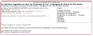 Lorsque vous êtes sur la notice d’une thèse, il est possible de cliquer sur les champs École doctorale, Spécialité, Responsabilité scientifique (directeur de thèse) afin d’obtenir la liste de tous les contenus de la base contenant la même valeur.