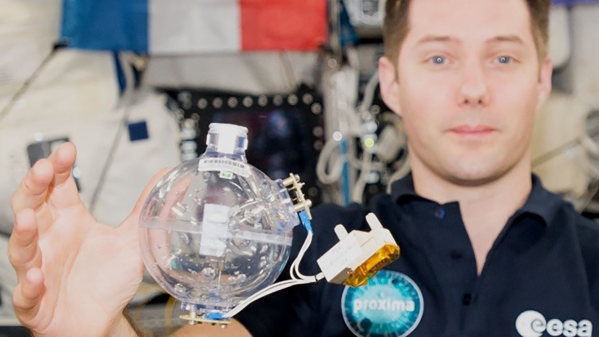 Thomas Pesquet présente le réservoir utilisé dans l’expérience Fluidics. La sphère instrumentée est partiellement remplie d’eau.