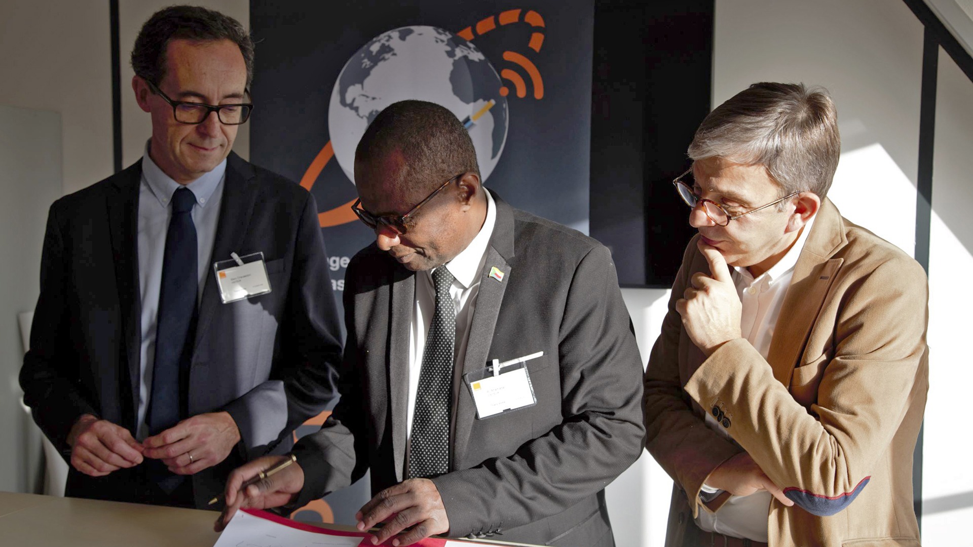 Marc Chaussidon (directeur de l’IPGP), Ahmada Al Karani (chairman du management committee du consortium Fly-Lion 3, directeur de Comores Câbles), Jean-Luc Vuillemin (Executive Vice President de Orange International Networks Infrastructure & Services, président du comité de surveillance de Orange Marine), signataires de la convention.