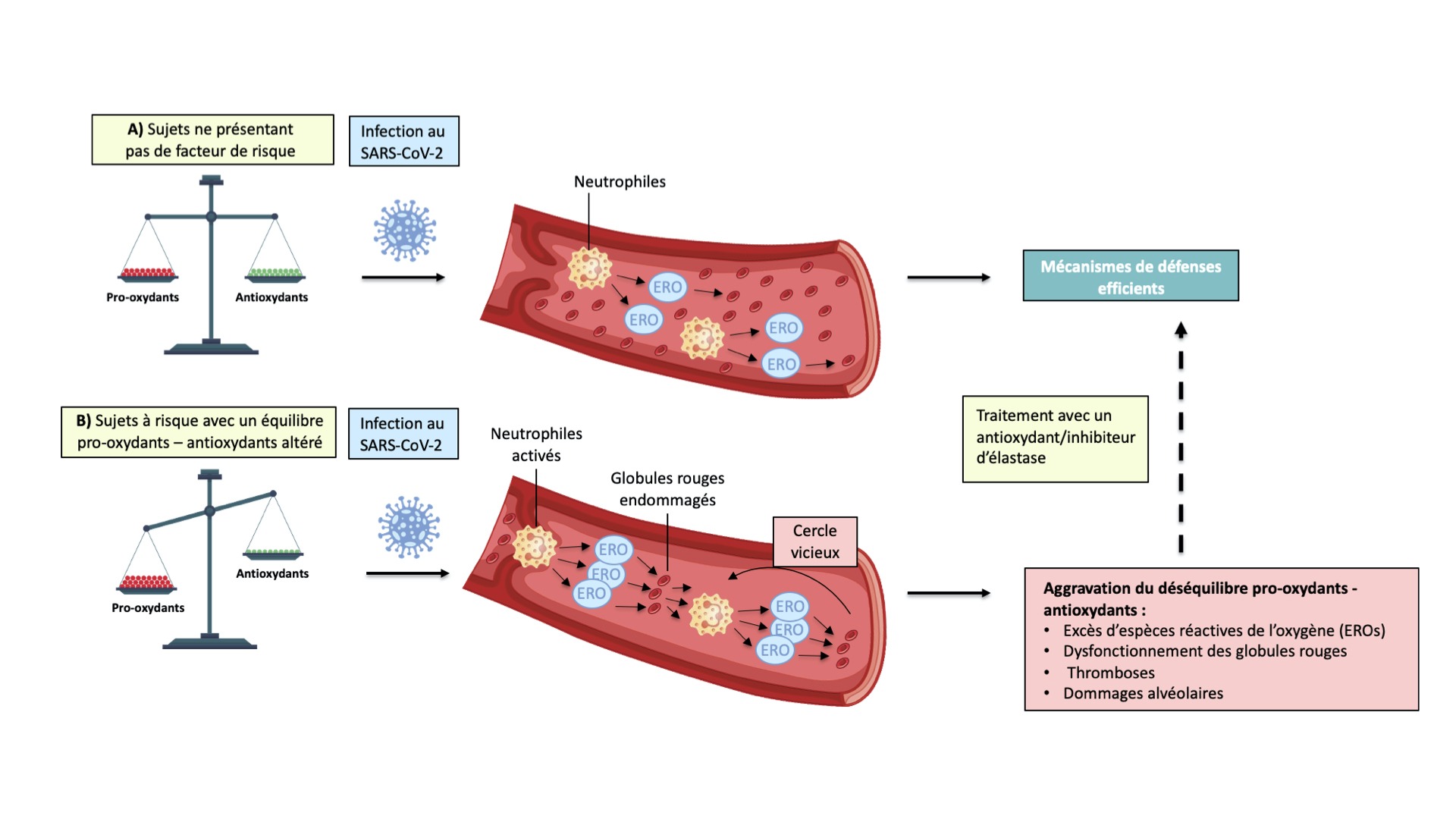 B) Chez des sujets présentant un déséquilibre entre les pro-oxydants et les antioxydants, les EROs produits ne sont pas correctement éliminés. Ces EROs peuvent alors agir sur la membrane de cellules comme les globules rouges entrainant ainsi leur dysfonctionnement. En retour, les globules rouges endommagés vont contribuer à maintenir l’activation des neutrophiles, générant un cercle vicieux. Ce stress oxydatif résultant de la production d’EROs mal contrôlée peut être responsable des dommages au niveau des alvéoles pulmonaires, des thromboses, et d’une perte de capacité de fixation de l’oxygène des globules rouges, observés dans la COVID-19. Des traitements antioxydants et des inhibiteurs d’élastase ciblant les neutrophiles pourraient ainsi ouvrir de nouvelles voies thérapeutiques