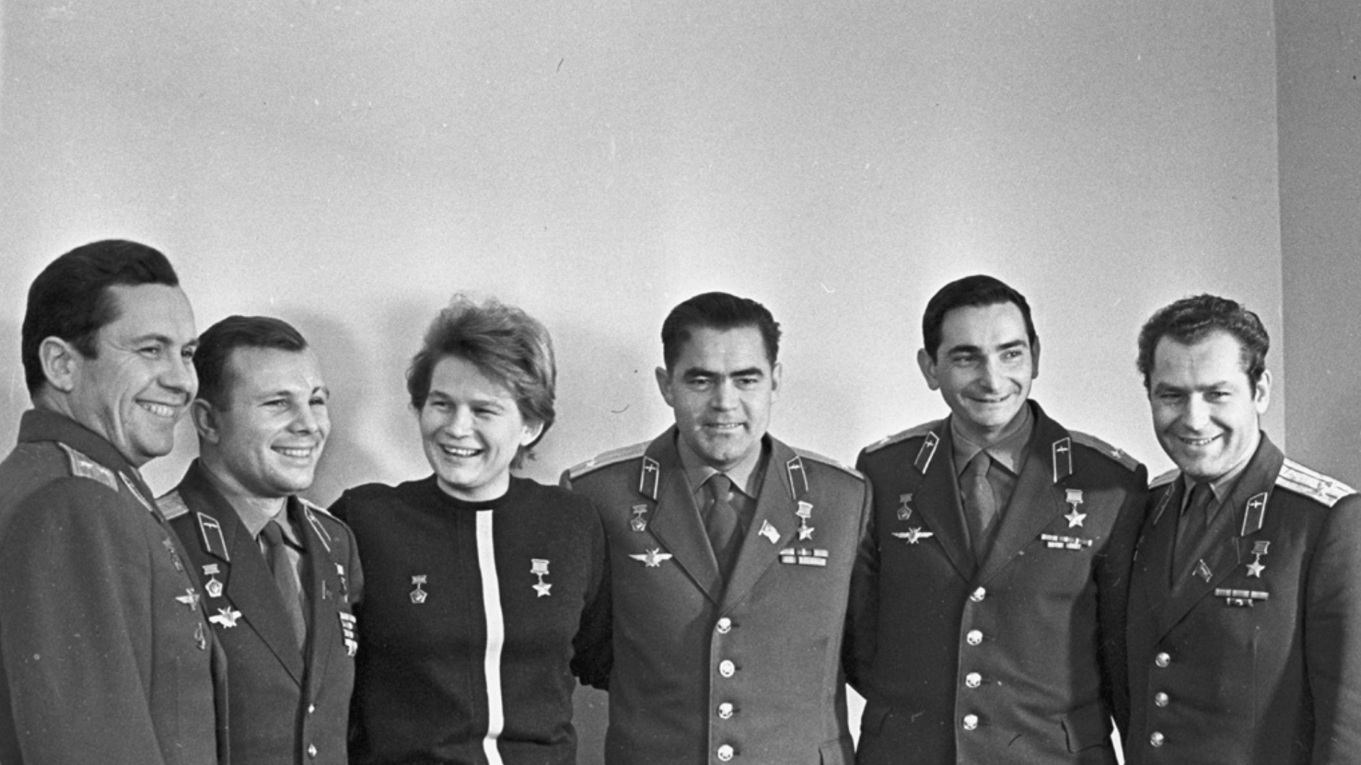 Les six cosmonautes des missions du programme Vostok : Pavel Popovitch, Iouri Gagarine, Valentina Terechkova, Andrian Nikolaïev, Valeri Bykovski et German Titov.