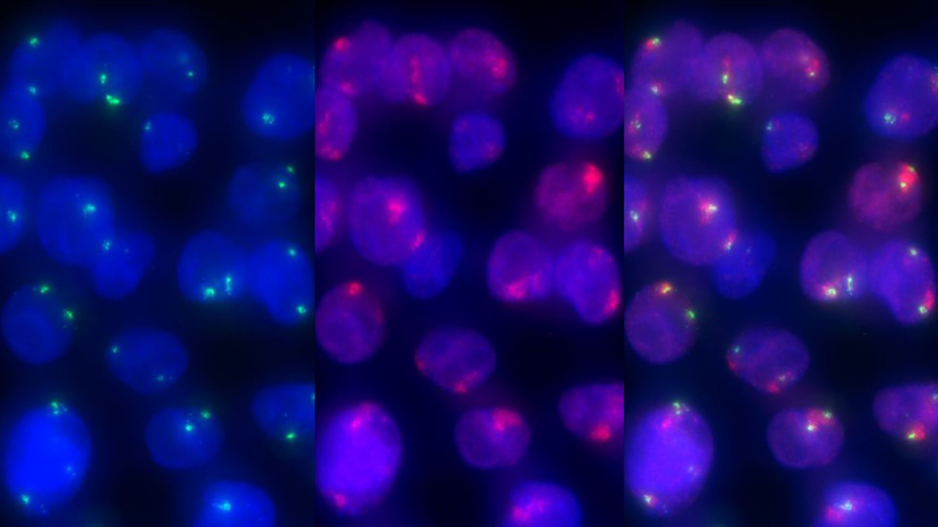 Female human embryonic stem cells that resemble the young human epiblast (embryo proper), which is yet to silence one of its two X chromosomes. The active X chromosomes can be identified by expression from a single locus such as X-linked lncRNA XACT (green) or at a global level by the cloud of transcription (red) coming from the X.