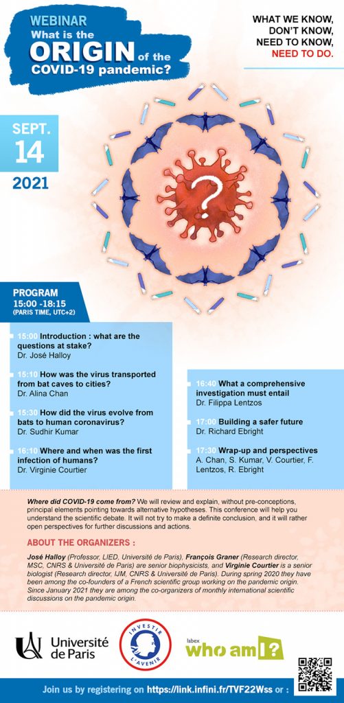 Rendez-vous le 14 septembre pour une conférence (en anglais, en ligne et soutenue par le Labex Who Am I?) au sujet de ce qui est connu et ce qu’il reste à connaître concernant les origines de la Covid-19.